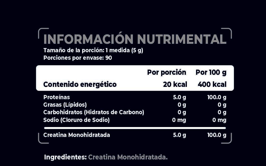 Suplemento de creatina monohidratada 100% pura y micronizada de alta calidad. La micronización mejora la solubilidad y absorción, haciéndola más efectiva. Ideal para atletas y personas que buscan mejorar su rendimiento físico y aumentar masa muscular. Cada envase contiene 90 porciones de 5g.